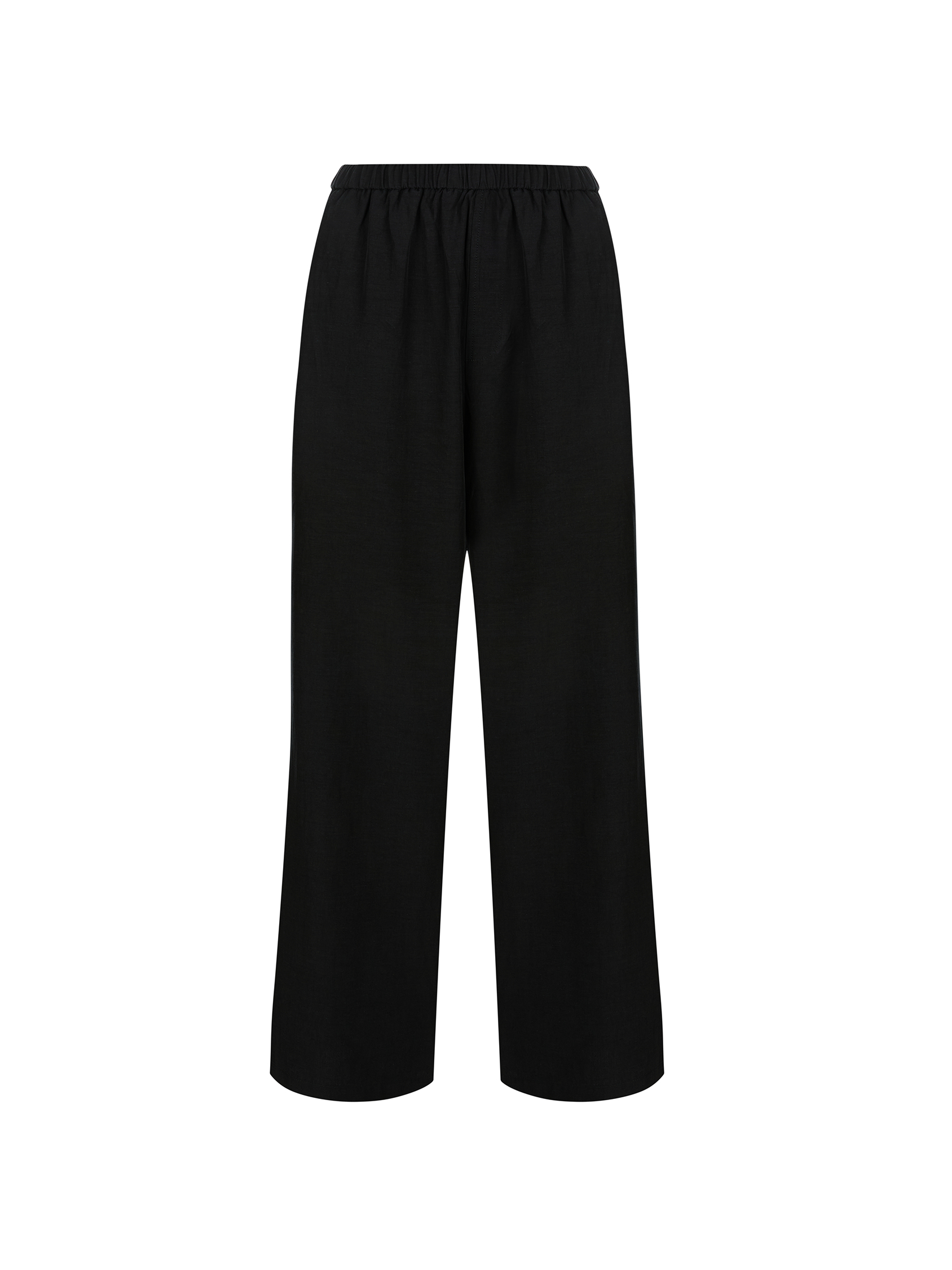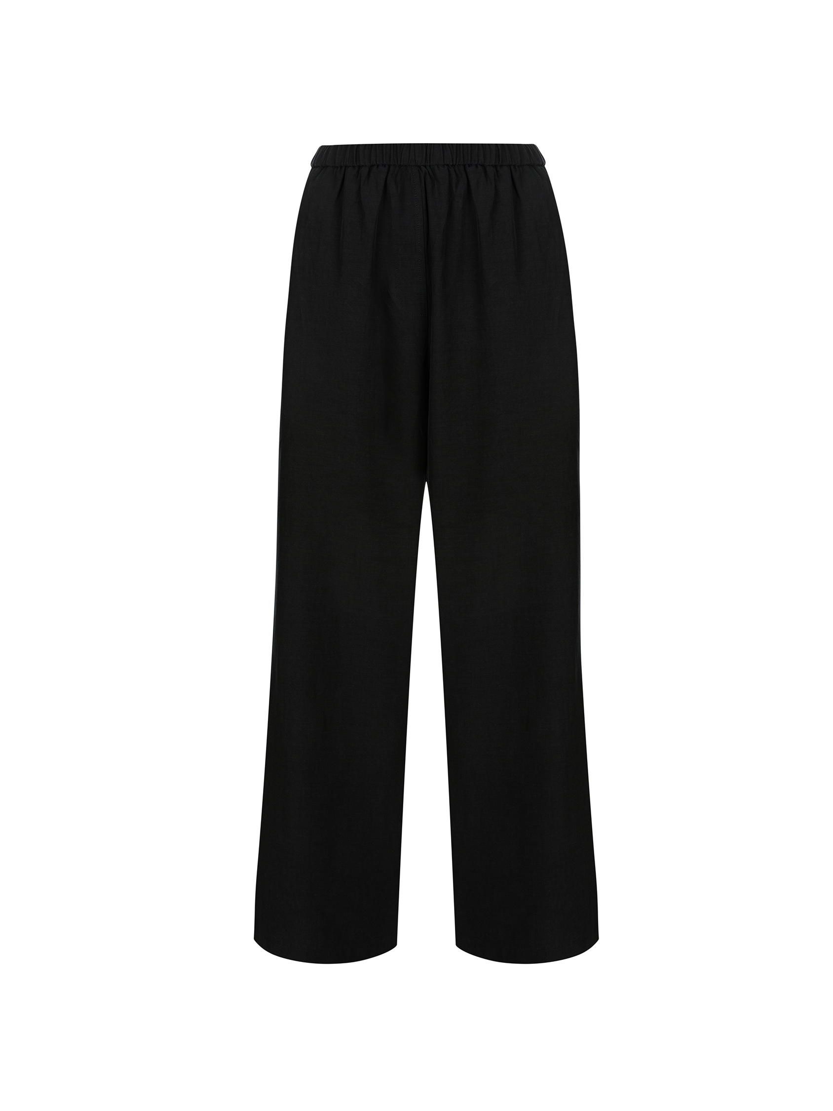 Брюки свободного кроя в базовом оттенке. Модель с высокой посадкой и удлиненным кроем вытягивает силуэт, а легкая и струящаяся ткань создает акцент в расслабленных образах. Модель с поясом на резинке.