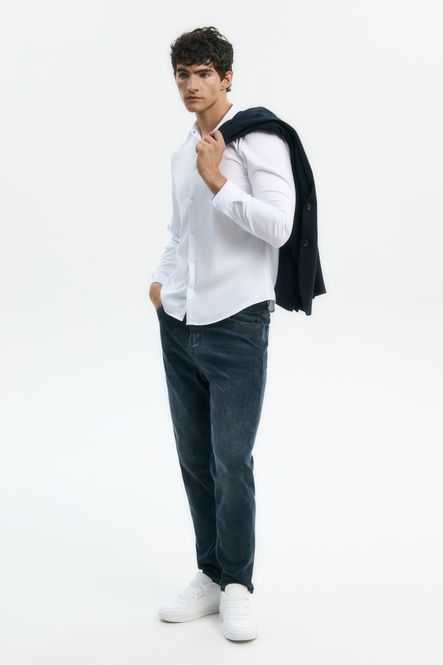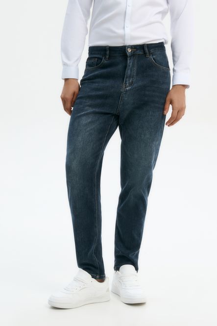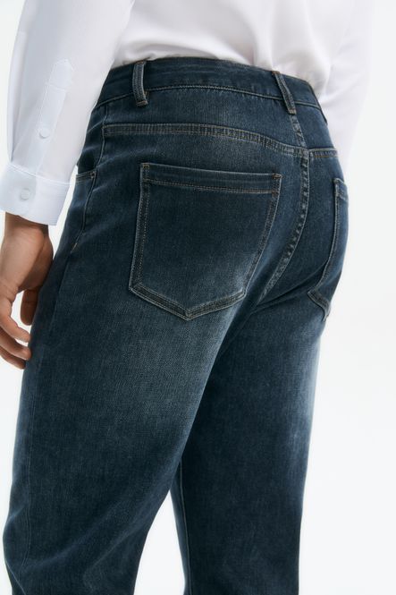 Прямые джинсы с карманами сшили из хлопкового денима с добавлением эластичных волокон. Благодаря такому материалу изделие хорошо садится по фигуре и комфортно носится, не стесняя движений. Слегка выбеленную модель с классической посадкой дополнили кожаным патчем на поясе сзади. Один из задних карманов акцентировали контрастной строчкой.