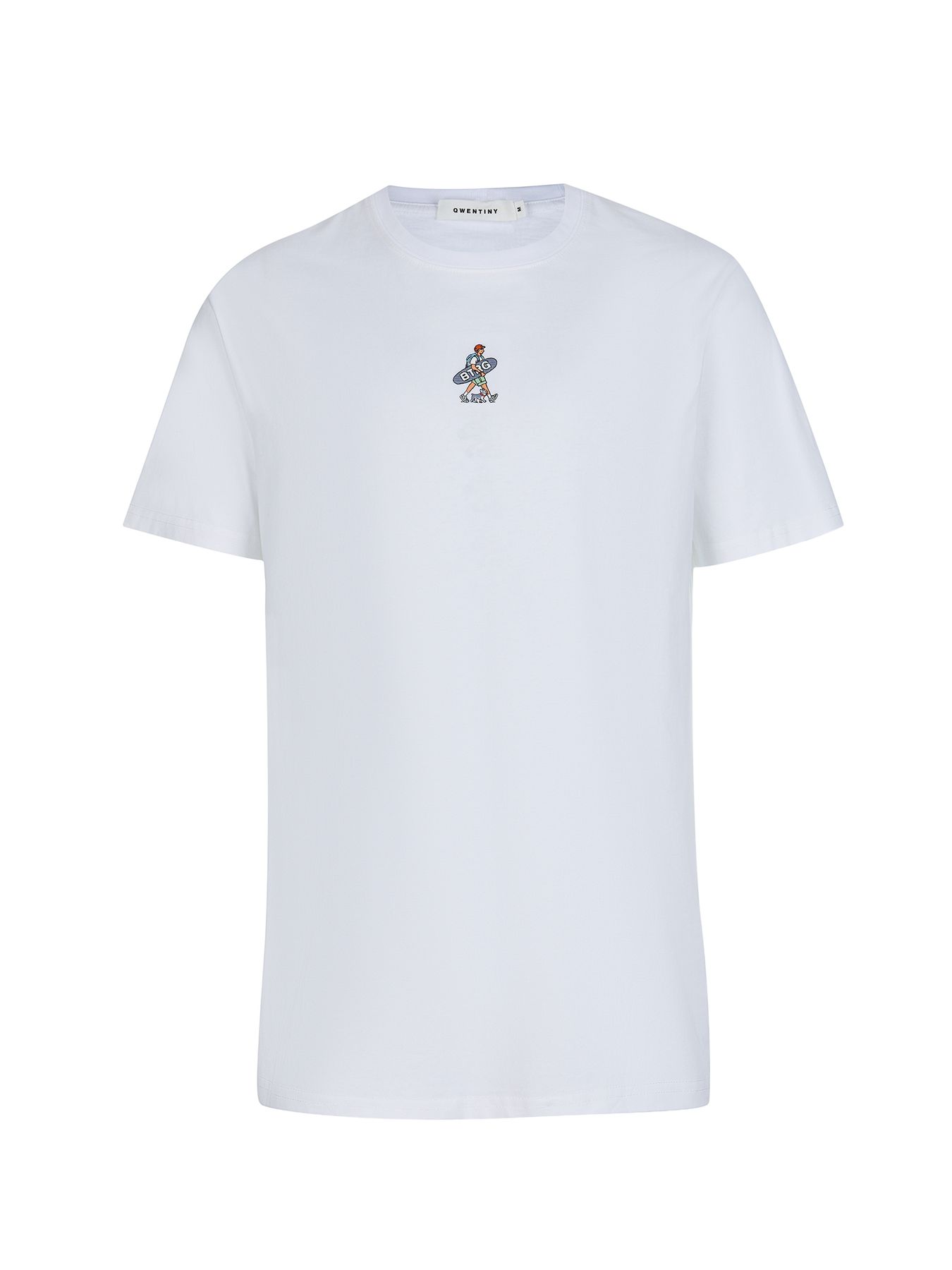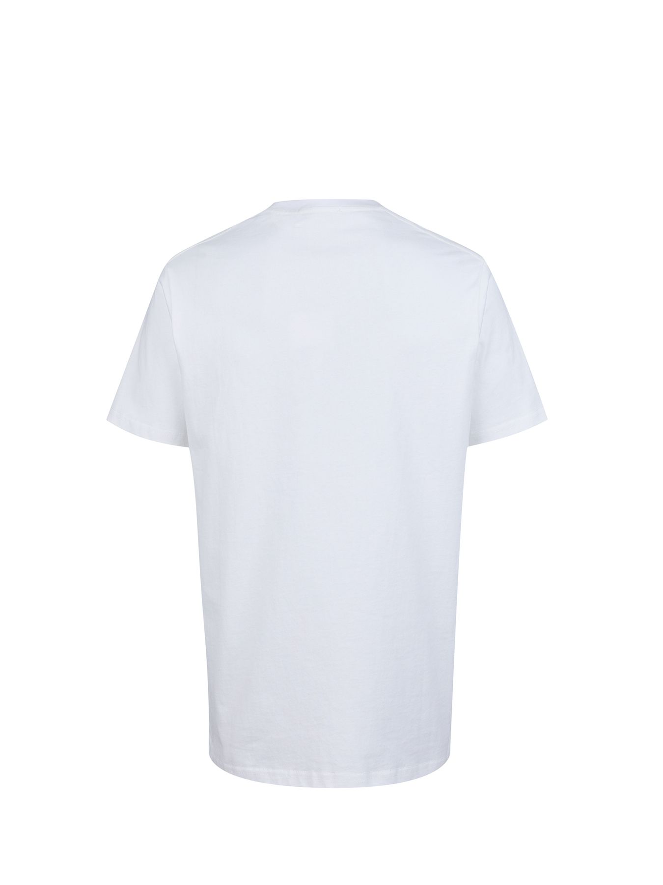 Мужская футболка с принтом из 100% хлопка в базовом белом цвете. Модель имеет прямой силуэт, короткие свободные рукава, круглый вырез горловины. Универсальный фасон легко сочетается с разными стилями.