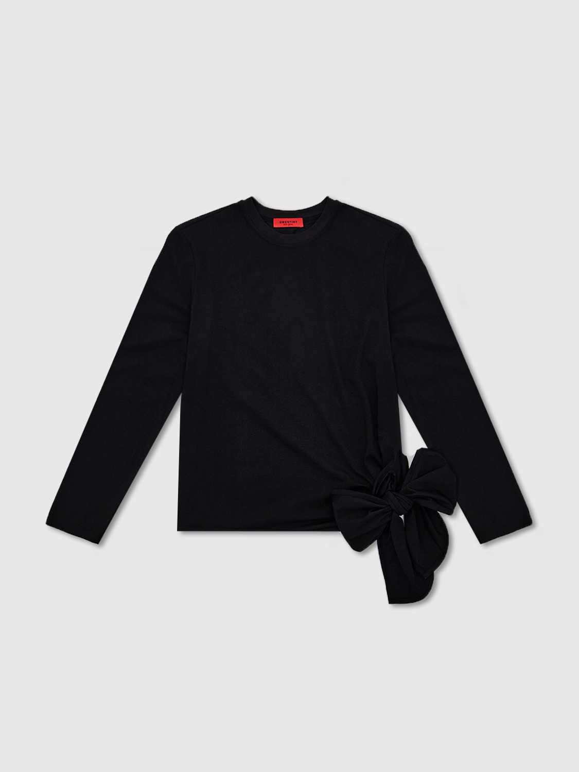 Лонгслив свободного кроя имеет комфортную посадку и подходит для повседневной носки. Модель выполнена из смесового материала с модалом, хлопком и добавлением шерсти, что обеспечивает мягкость и комфорт в прохладную погоду. Длинный рукав и лаконичный силуэт делают изделие универсальным, а декоративный бант придает образу аккуратный акцент и легкую женственность.